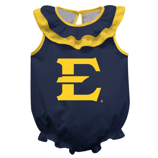 ETSU Buccaneers Swirls Blue Sleeveless Ruffle One Piece Jumpsuit Logo Bodysuit by Vive La Fete