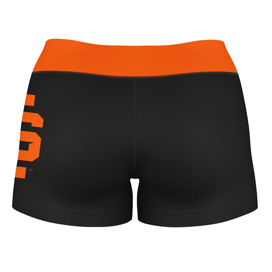 Idaho State Bengals ISU Logo on Thigh and Waistband Black & Orange Booty Workout Shorts by Vive La Fete