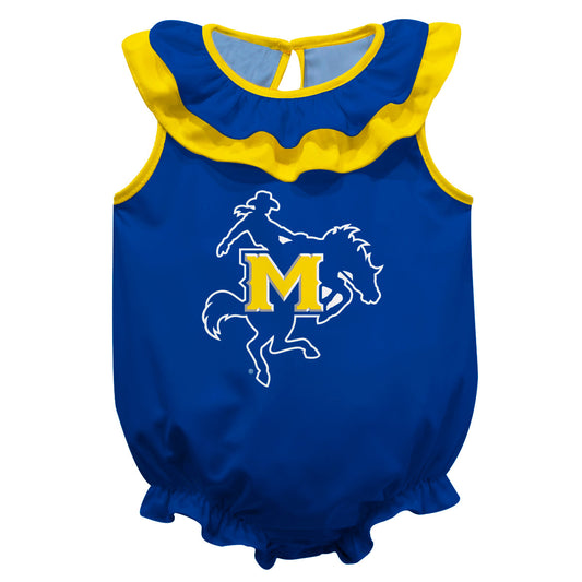 McNeese State University Cowboys Blue Sleeveless Ruffle One Piece Jumpsuit Logo Bodysuit by Vive La Fete