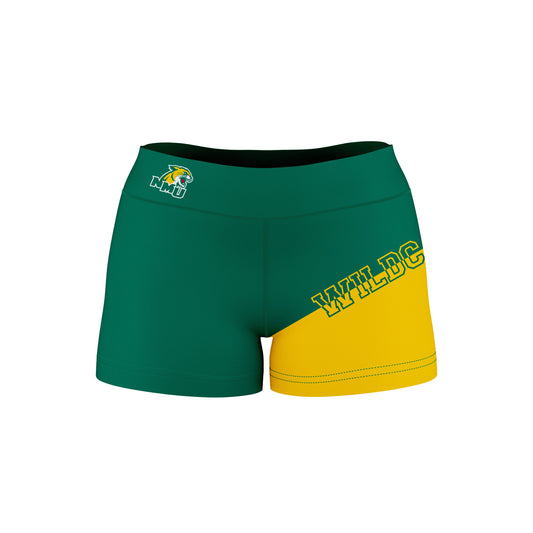 NMU Northern Michigan Wildcats Game Day Collegiate Leg Color Block Green Gold Optimum Womens Yoga Shorts by Vive La Fete