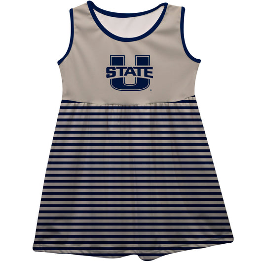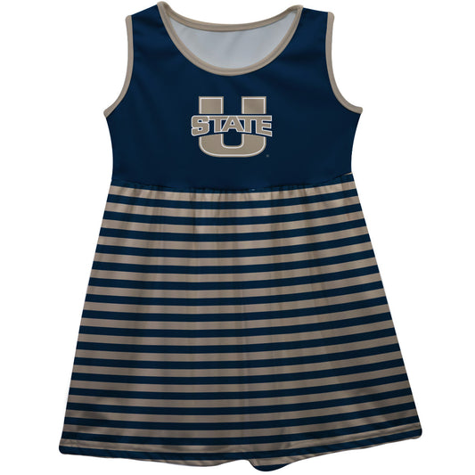 Utah State Aggies USU Girls Game Day Sleeveless Tank Dress Solid Navy Logo Stripes on Skirt by Vive La Fete