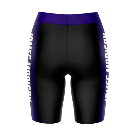 JMU Dukes Game Day Logo on Waistband and Purple Stripes Black Womens Bike Shorts by Vive La Fete