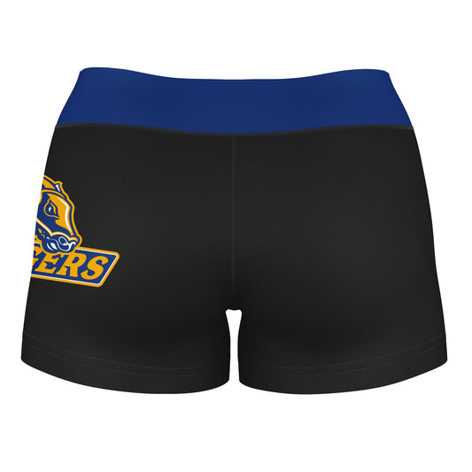 UW Wisconsin Stout Blue Devils Logo on Thigh & Waistband Black & Blue Womens Yoga Booty Workout Shorts by Vive La Fete