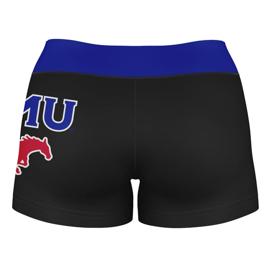 SMU Mustangs Game Day Logo on Thigh and Waistband Black & Blue Womens Yoga Booty Workout Shorts by Vive La Fete