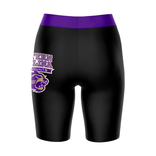 Western Carolina Catamounts Game Day Logo on Waistband and Purple Stripes Black Womens Bike Shorts by Vive La Fete