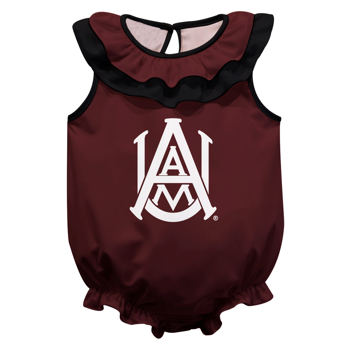 Alabama A&M Bulldogs Maroon Sleeveless Ruffle One Piece Jumpsuit Logo Bodysuit by Vive La Fete