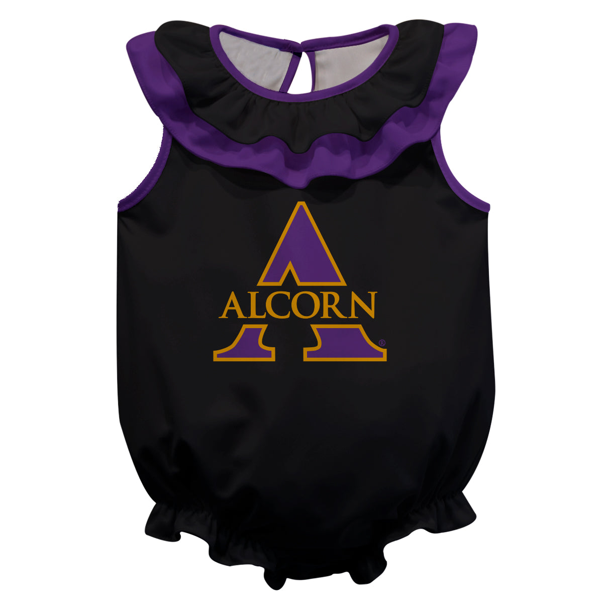 Alcorn State University Braves Black Sleeveless Ruffle One Piece Jumpsuit Mascot Bodysuit by Vive La Fete