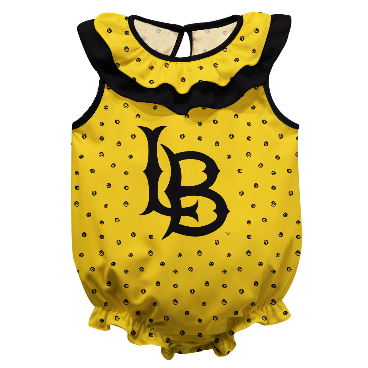Cal State Long Beach 49ers Swirls Gold Sleeveless Ruffle One Piece Jumpsuit Logo Bodysuit by Vive La Fete