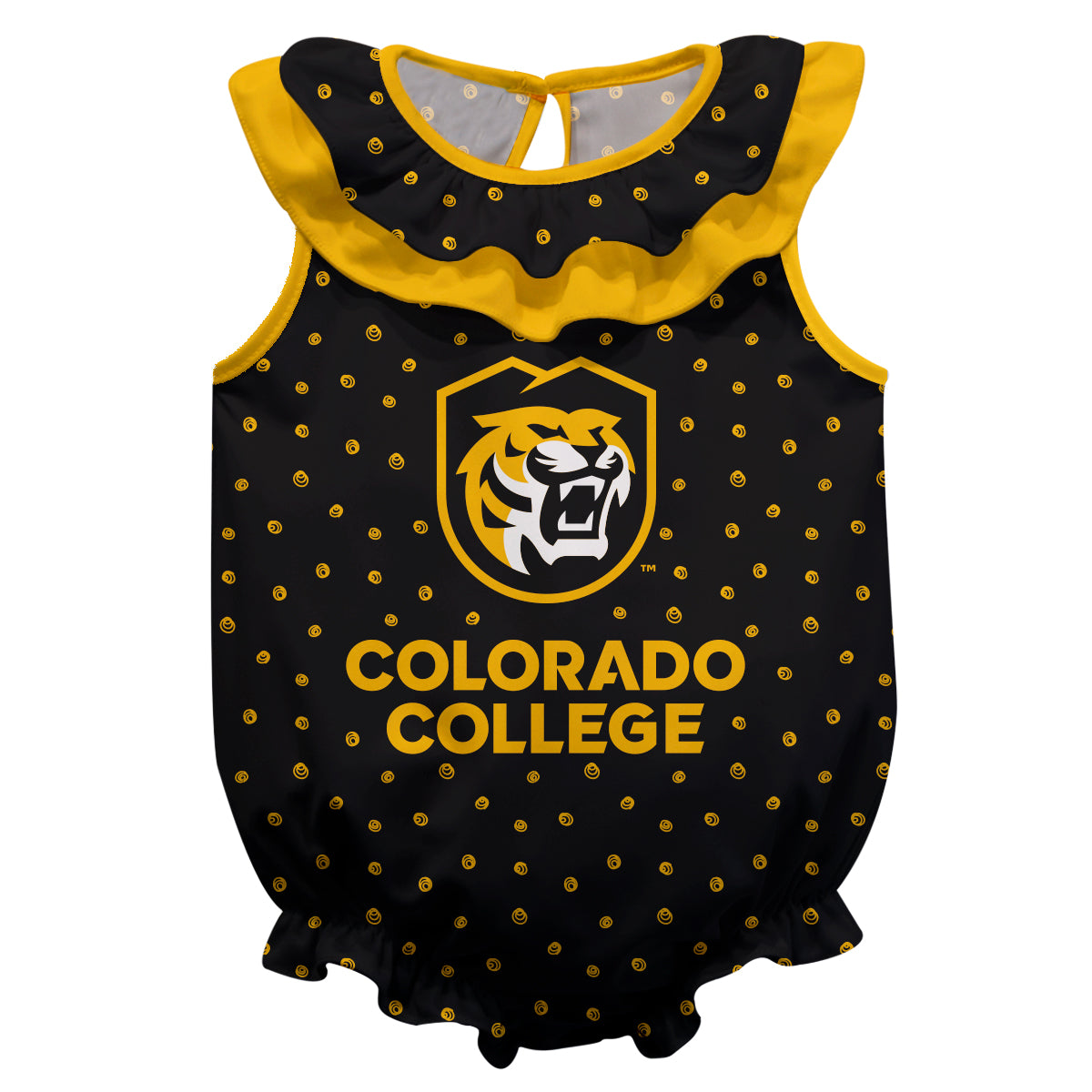 Colorado College Tigers Swirls Black Sleeveless Ruffle One Piece Jumpsuit Logo Bodysuit by Vive La Fete
