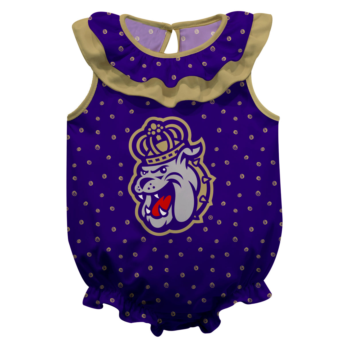 JMU Dukes Swirls Purple Sleeveless Ruffle One Piece Jumpsuit Logo Bodysuit by Vive La Fete