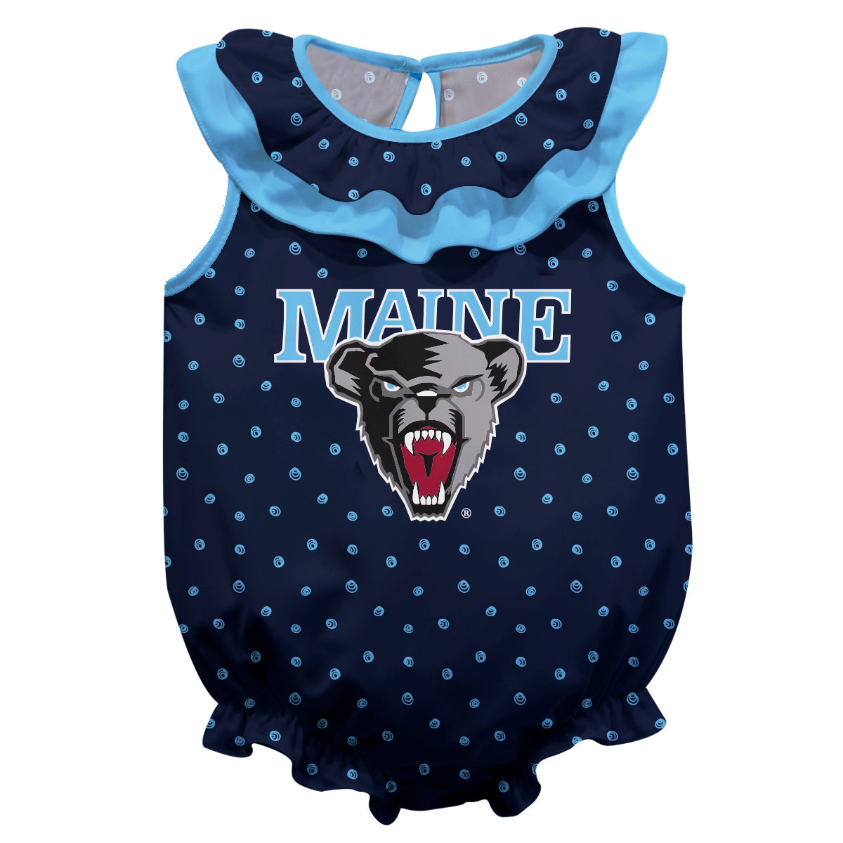 Maine Black Bears Swirls Blue Sleeveless Ruffle One Piece Jumpsuit Logo Bodysuit by Vive La Fete