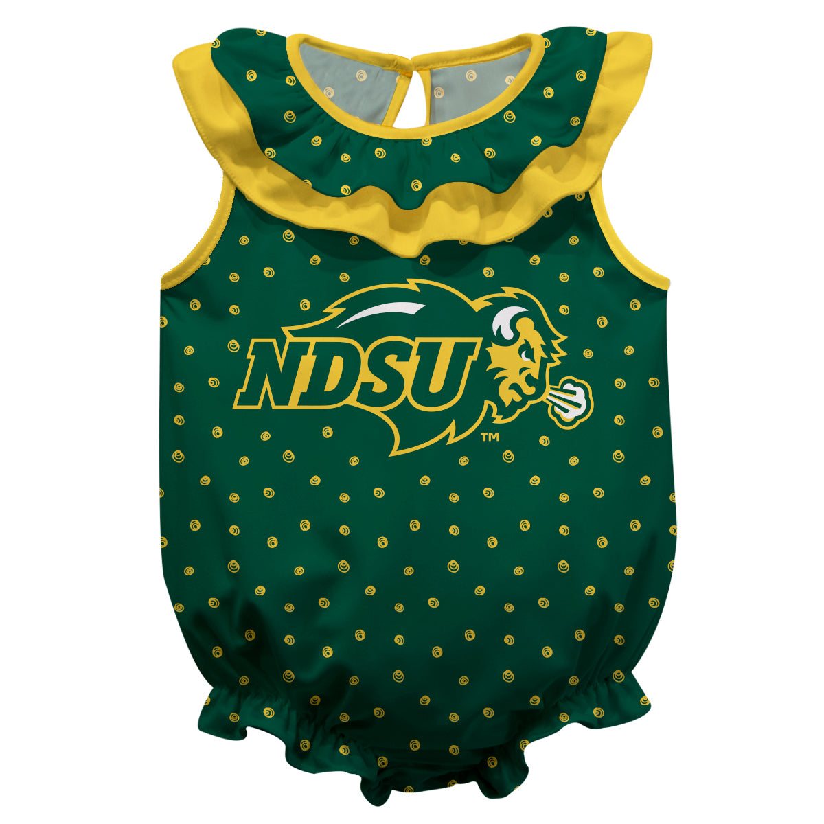 North Dakota Bison Swirls Green Sleeveless Ruffle One Piece Jumpsuit Logo Bodysuit by Vive La Fete