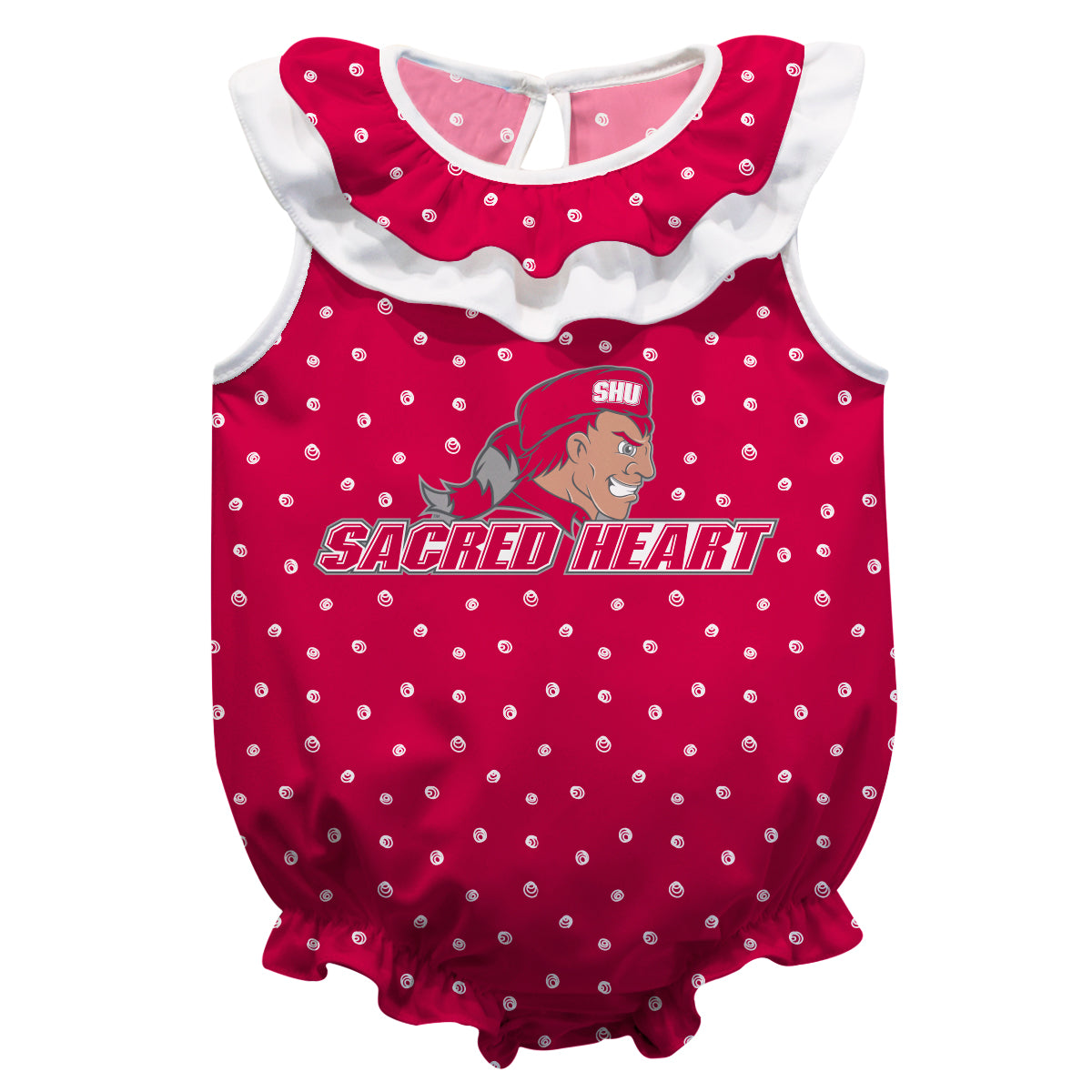 SHU Sacred Heart University Pioneers Swirls Red Sleeveless Ruffle One Piece Jumpsuit Logo Bodysuit by Vive La Fete