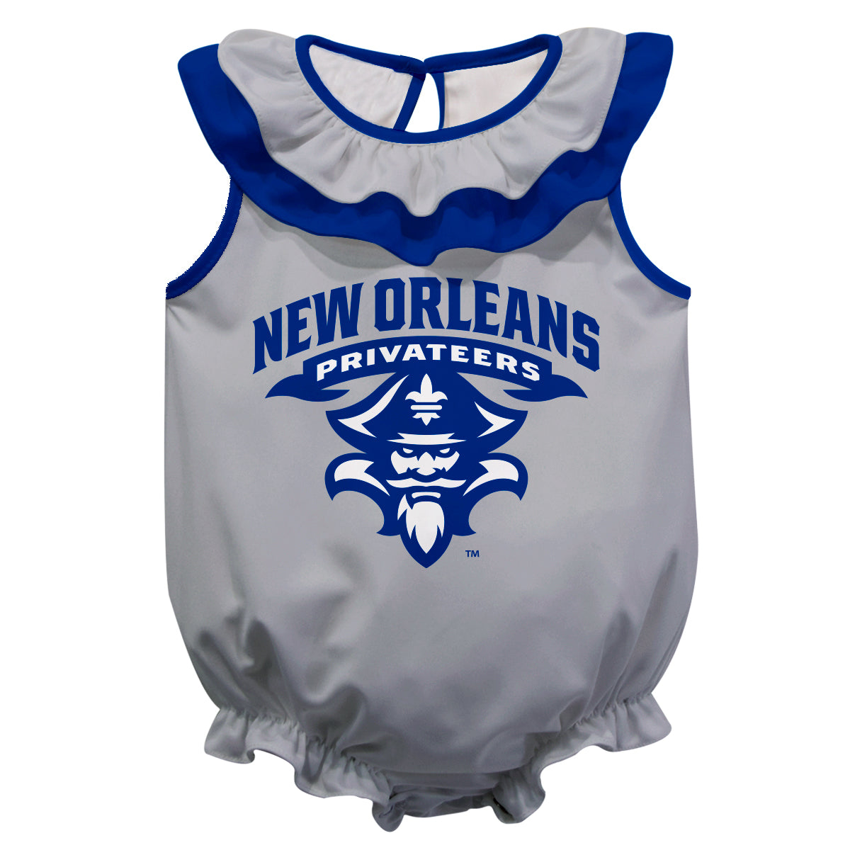 University of New Orleans Privateers UNO Gray Sleeveless Ruffle One Piece Jumpsuit Logo Bodysuit by Vive La Fete