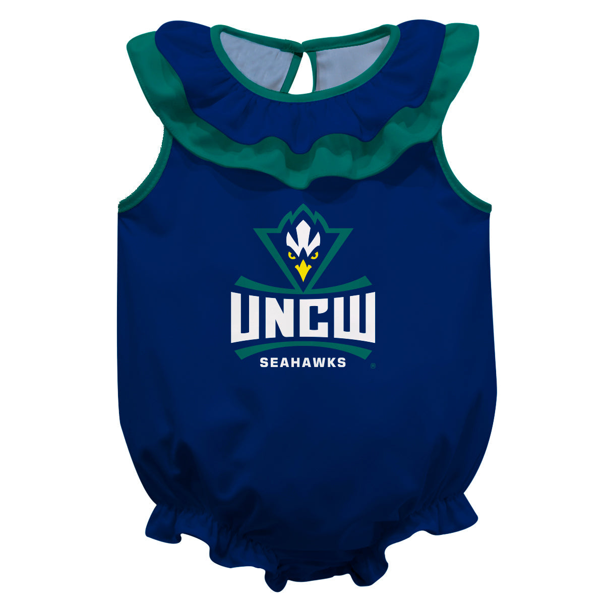 University of North Carolina Seahawks UNCW Navy Sleeveless Ruffle One Piece Jumpsuit Logo Bodysuit by Vive La Fete