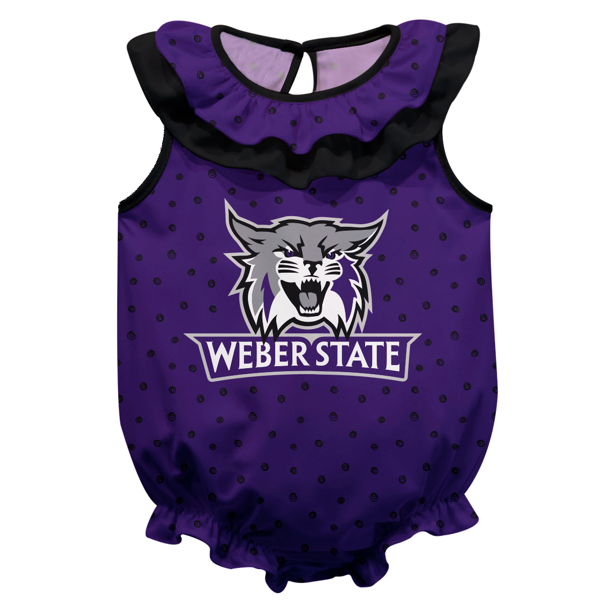 Weber State Wildcats WSU Swirls Purple Sleeveless Ruffle One Piece Jumpsuit Logo Bodysuit by Vive La Fete