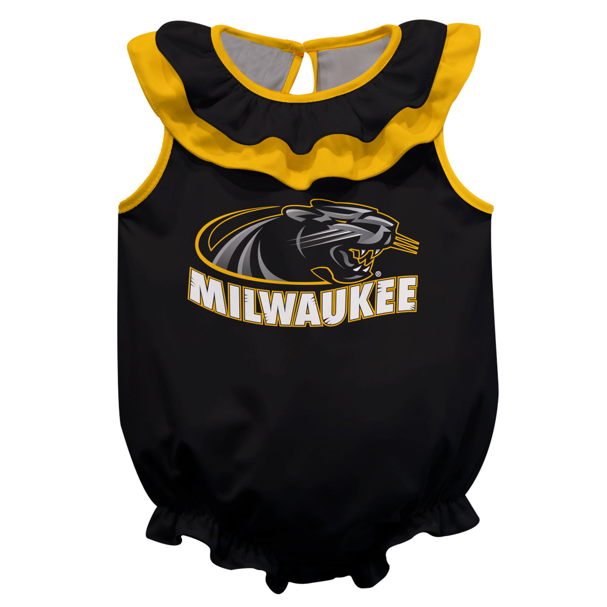 Wisconsin Milwaukee Panthers Black Sleeveless Ruffle One Piece Jumpsuit Mascot Bodysuit by Vive La Fete