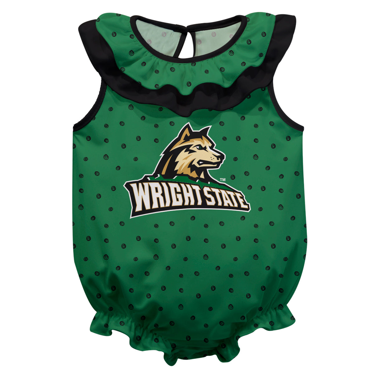 Wright State University Raiders Swirls Green Sleeveless Ruffle One Piece Jumpsuit Logo Bodysuit by Vive La Fete